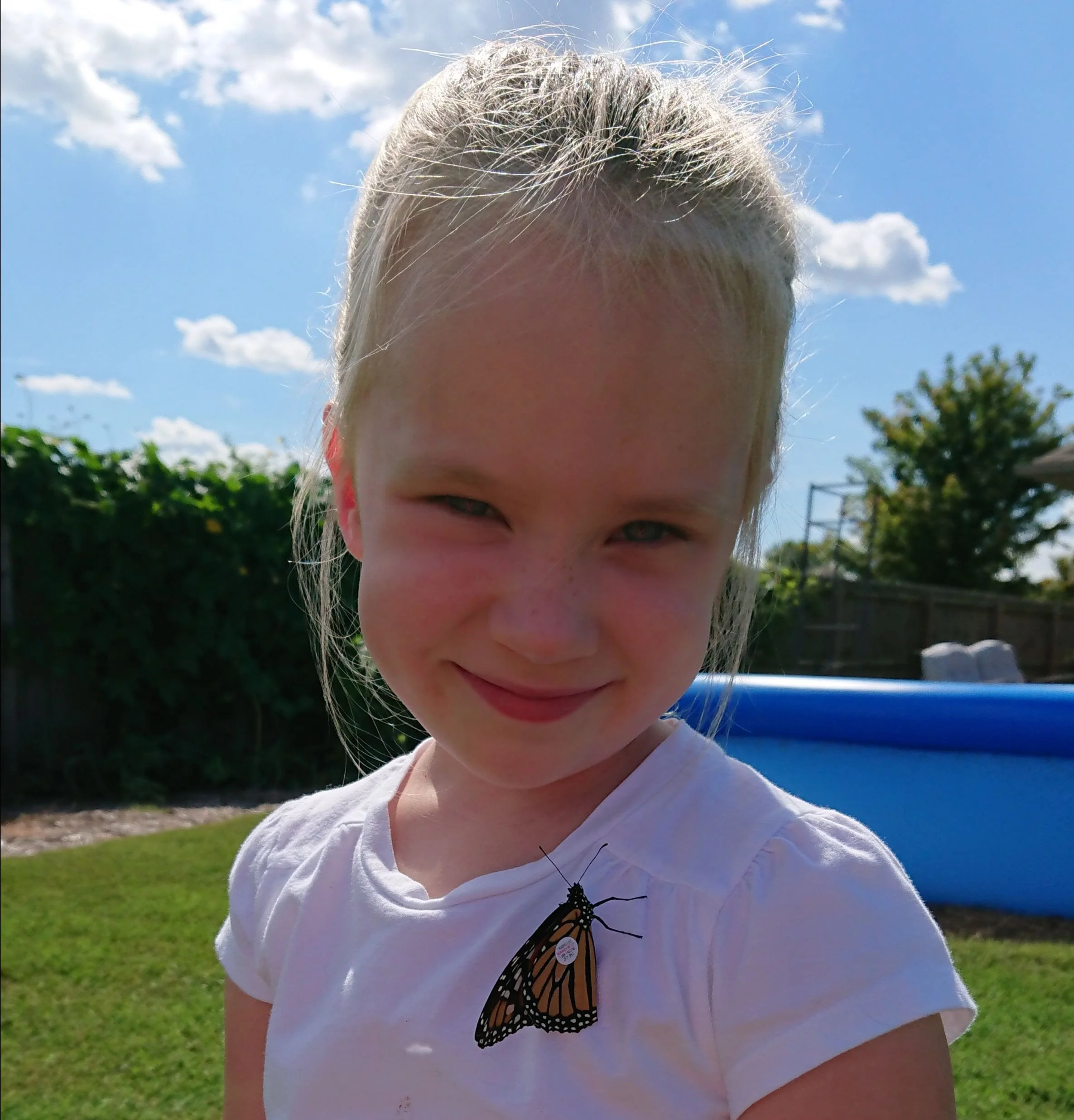 Young Lillian Geurtz with a tag for Monarch Watch. The tagging is a citizen science project that helps scientists track the routes of the Monarchs.